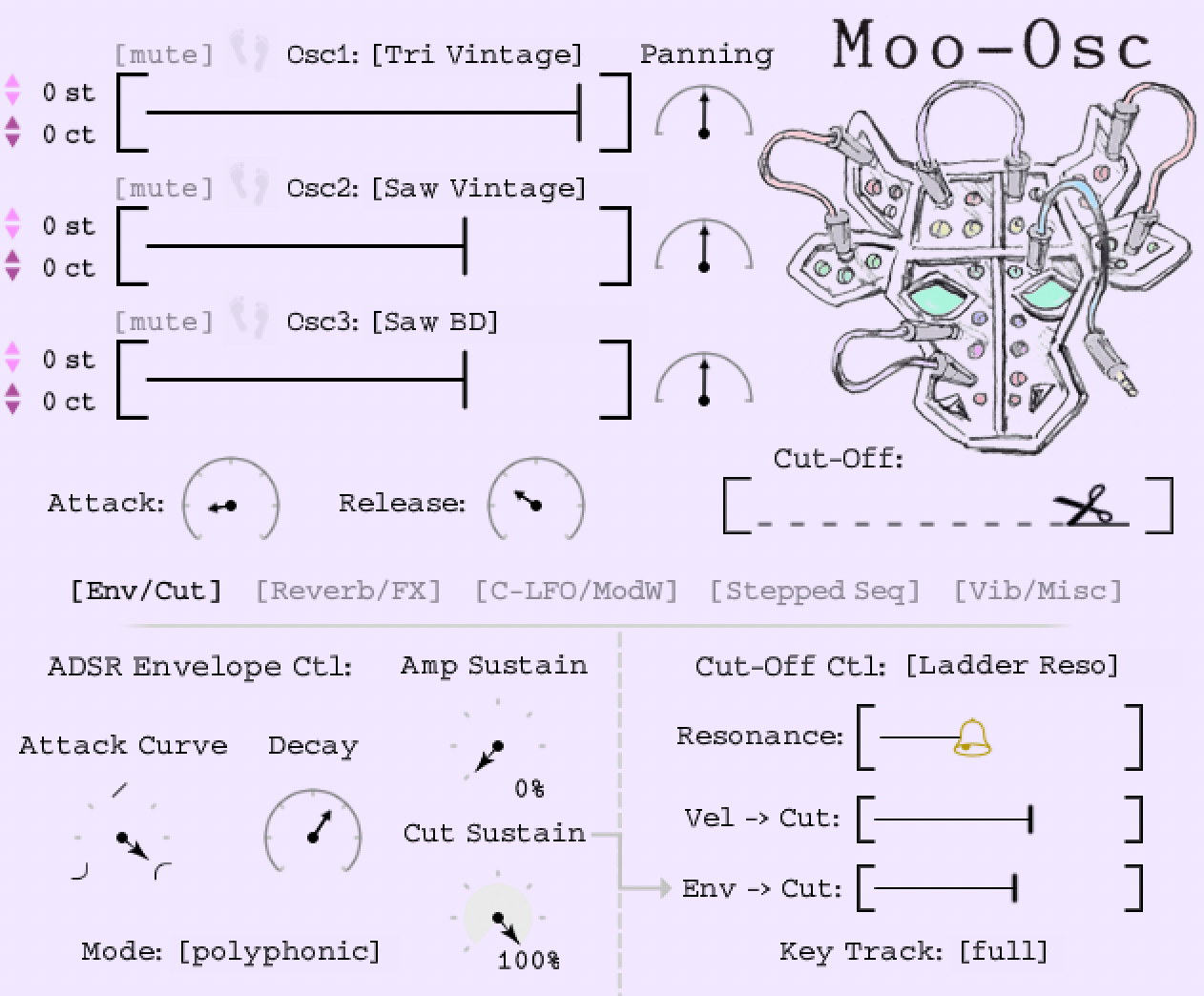 Moo-Osc was built with raw oscillator samples sourced from three distinct, iconic analog synthesizers. Boasting a diverse collection of 22 analog wave shapes, 30 custom convolution responses, and over 80 designed presets, Moo-Osc was created to seamlessly integrate a modern interface with a nod to the golden age of synthesis.