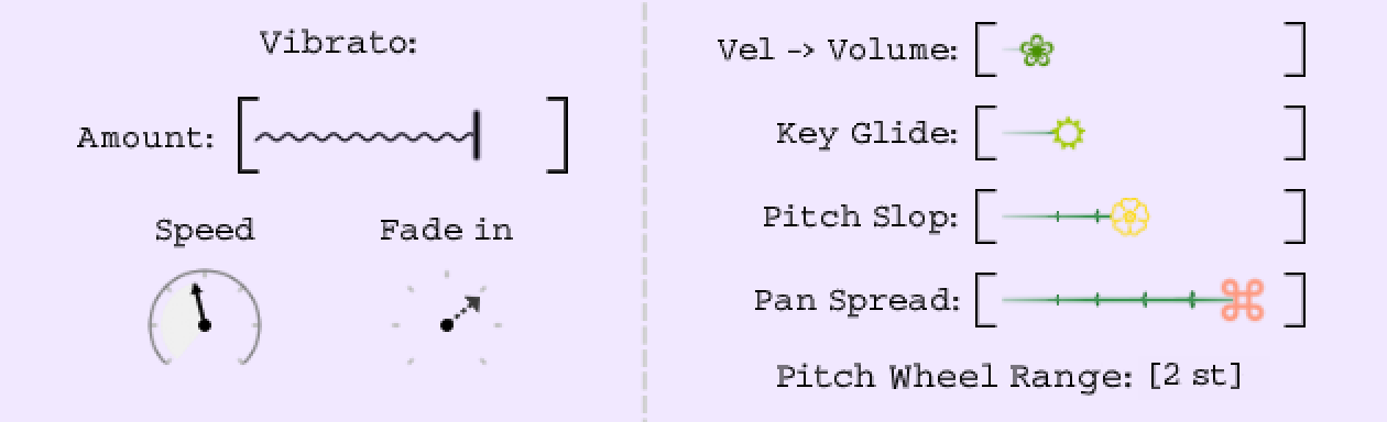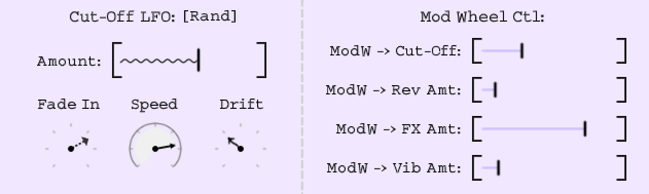 - Cut-Off LFO, Vibrato, Pitch Slop, and polyphonic Glide controls